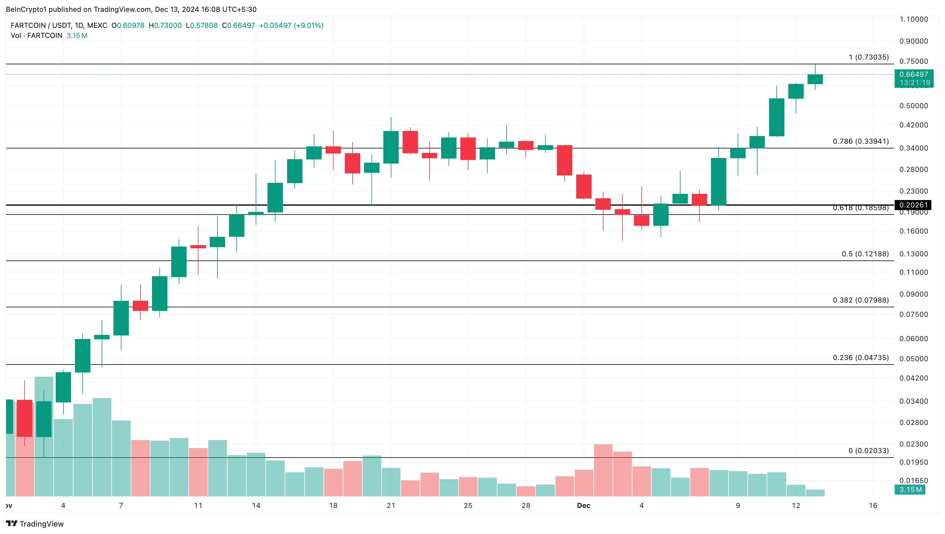 Fartcoin er en kryptovaluta, der var på listen over trending altcoins den 12. december og er tilbage på listen i dag. I går rapporterede BeInCrypto, at Solana meme coinen oversteg en markedsværdi på $500 millioner, hvilket gjorde den til en trending altcoin.