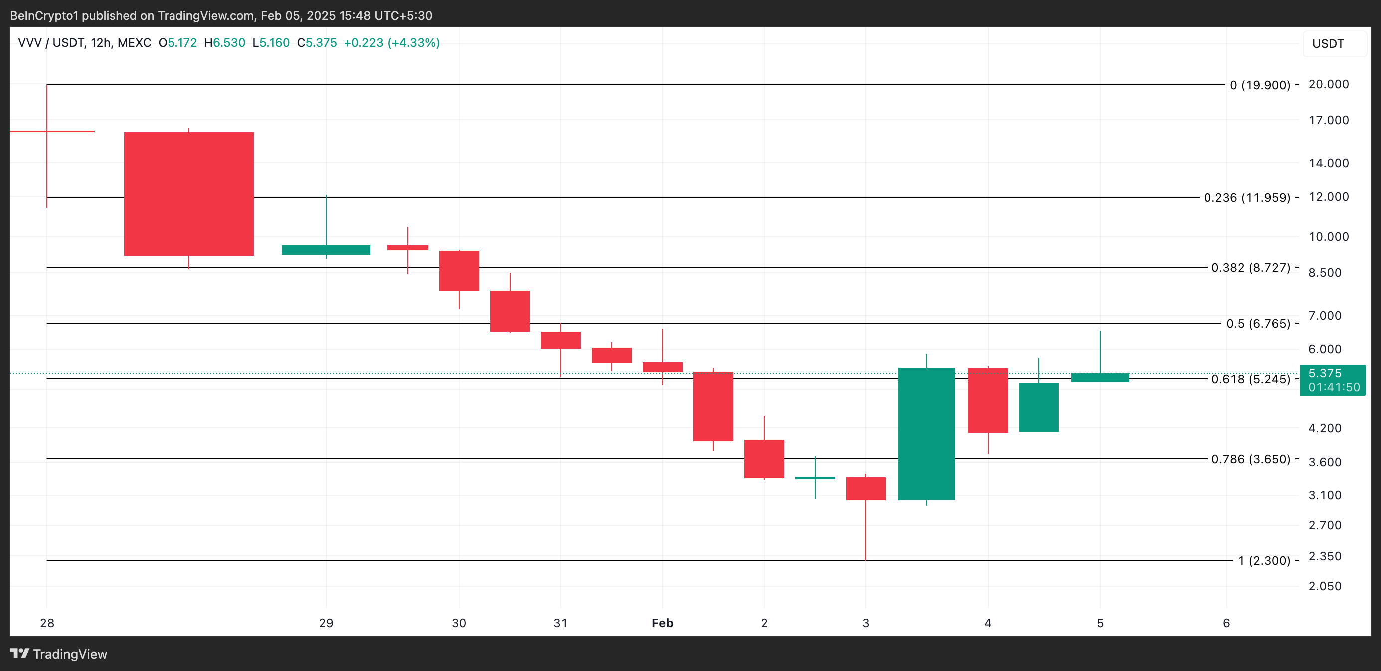Men disse påstande forbliver ubekræftede, da VVV noterer en tocifret stigning i dag. Hvis stigningen fortsætter, kan altcoinens kurs nå $6,75.