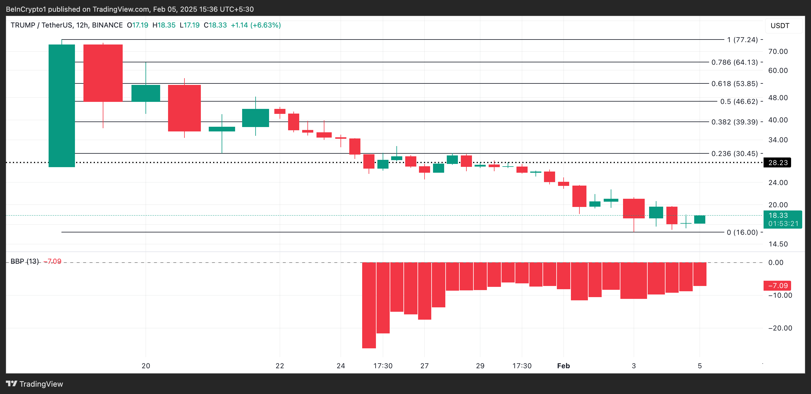 TRUMP handler til $18,33 i øjeblikket, med en kursstigning på 6% i de sidste 24 timer. Men på trods af denne stigning, viser aflæsninger fra dens 12-timers diagram, at bearish kontrol over meme coinen forbliver betydelig.