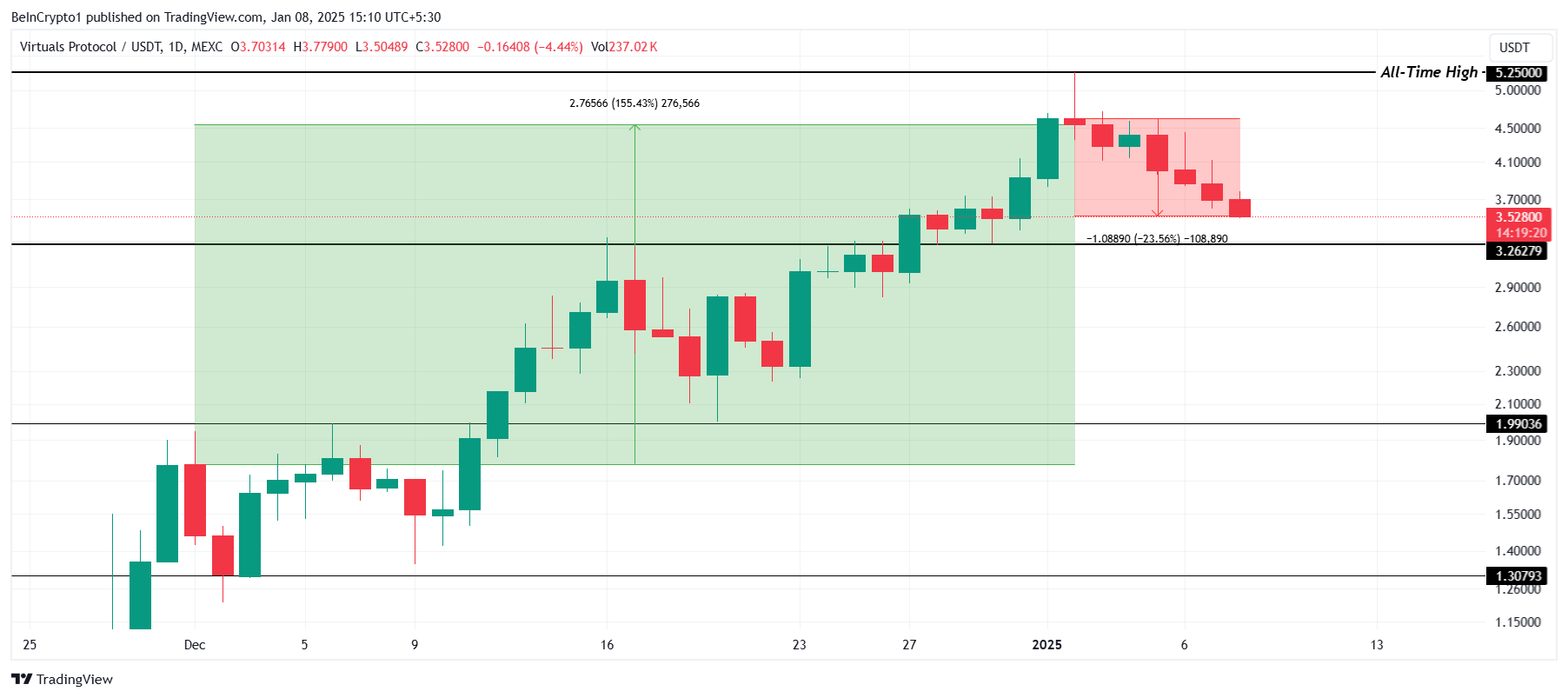 Med en kurs over $3,26 har VIRTUAL en mulighed for at komme sig, forudsat at investorer modstår trangen til at sælge. Et brud under $3,26 kan dog ugyldiggøre enhver chance for opsving, hvilket efterlader altcoinen sårbar over for yderligere fald.