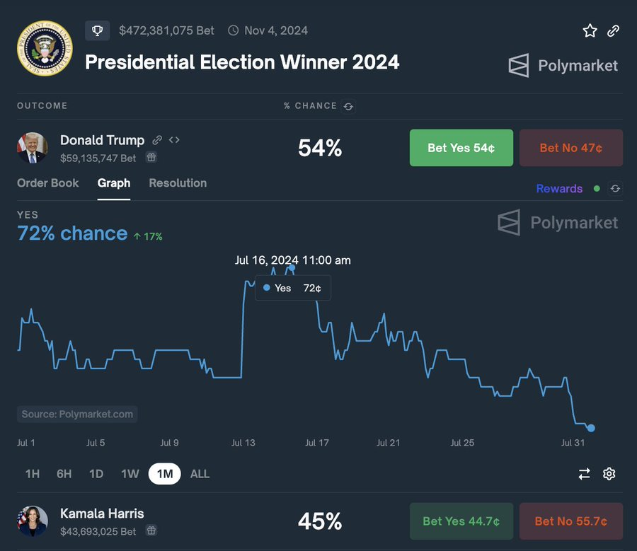 Den debat kommer midt i et fald i Trumps chancer for at vinde præsidentvalget, som er faldet til 54% fra en top på 72% i juli. Hans hovedrival, vicepræsident Kamala Harris, har fået vind i sejlene og for nylig sikret sin første store kryptoleder-tilslutning fra Upholds medstifter, J.P. Theriot.