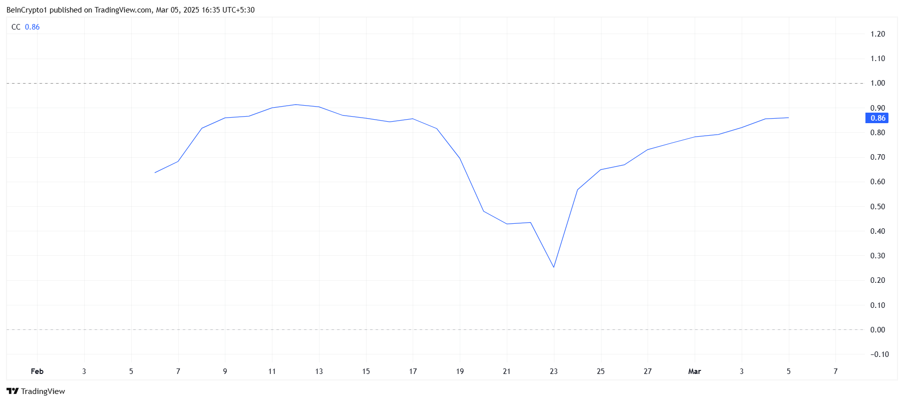 TRUMP har en stærk korrelation på 0.86 med Bitcoin (BTC), hvilket antyder, at altcoinen sandsynligvis vil følge BTC’s føring. Da BTC’s kurs også påvirkes af bredere markedstendenser, kan TRUMP’s kurs stige sammen med Bitcoin, hvis hypen omkring White House Crypto Summit fortsætter med at vokse.