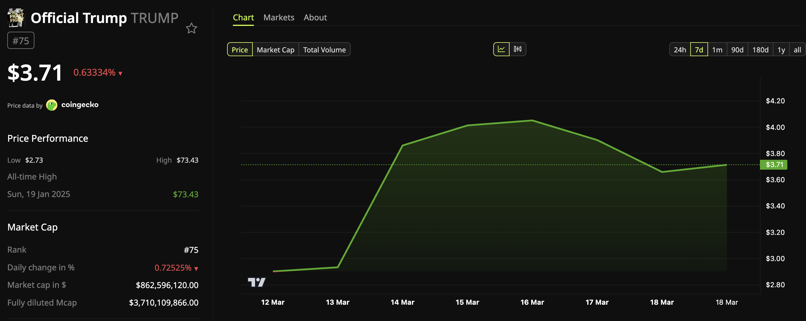 Siden da har tokenet tabt en del af disse gevinster. I øjeblikket handles TRUMP til $3,7, et fald på 0,63% det seneste døgn.
