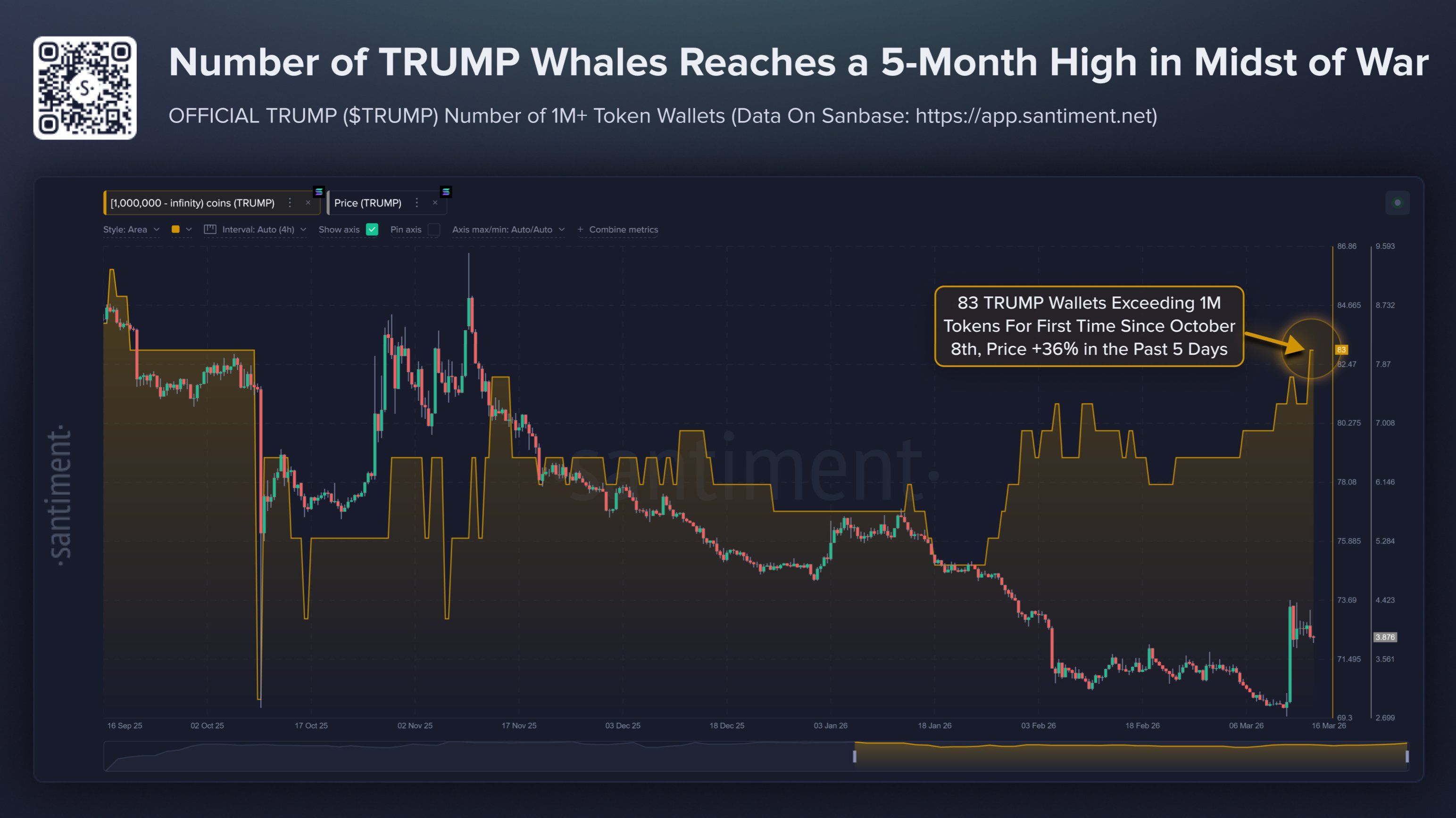 Wallets med over 1 million Official Trump (TRUMP) meme coins er steget til det højeste niveau i 5 måneder. Ifølge data fra Santiment findes der nu 83 sådanne adresser, en stigning der følger op mod et kommende holdejer-event på Mar-a-Lago.