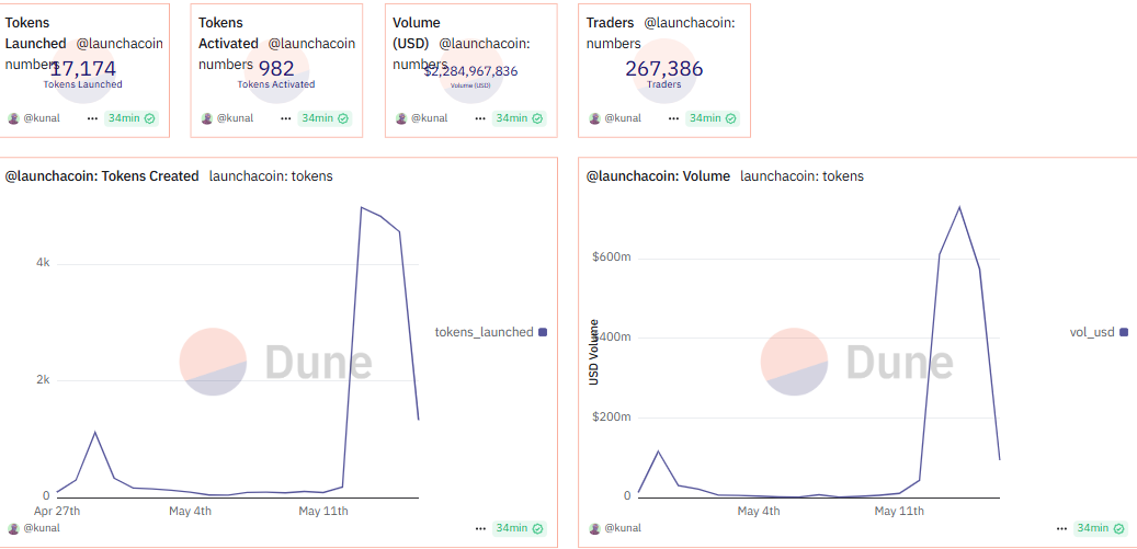 Data på Dune dashboardet viser, at platformen har over 17.000 tokens lanceret og 267.386 aktive handlende.
