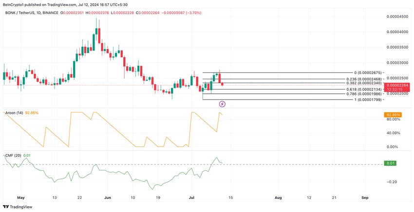 Desuden viser tokenens positive Chaikin Money Flow (CMF) likviditetsindstrømning til BONK-markedet. Det er nødvendigt for at opretholde dens nuværende prisstigning.