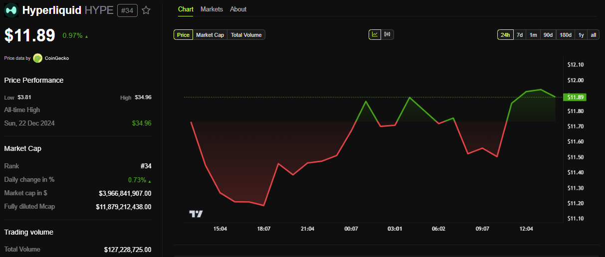 BeInCrypto data viser, at Hyperliquids HYPE token kurs var $11,89 i øjeblikket, oppe med beskedne 0,97% i de sidste 24 timer.