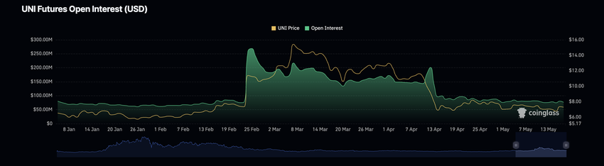 Ud over den reducerede hvalaktivitet har UNI’s åbne futures-interesse været nedadgående i den sidste uge. Den lå på 76 millioner dollars ved redaktionens slutning og er faldet med 5 % i løbet af de sidste syv dage.