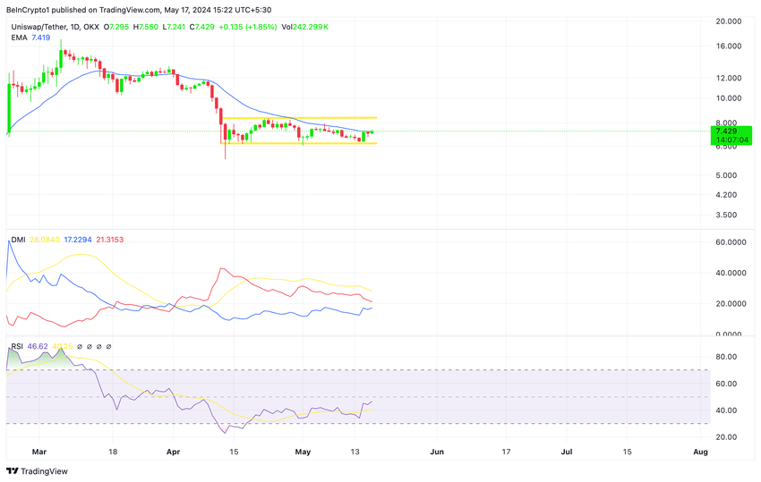 I skrivende stund handles UNI til 7,48 $ og stiger mod den øverste linje i denne kanal, som udgør modstanden. Der er dog masser af bearish aktivitet, som muligvis vil tvinge kursen tilbage mod support.