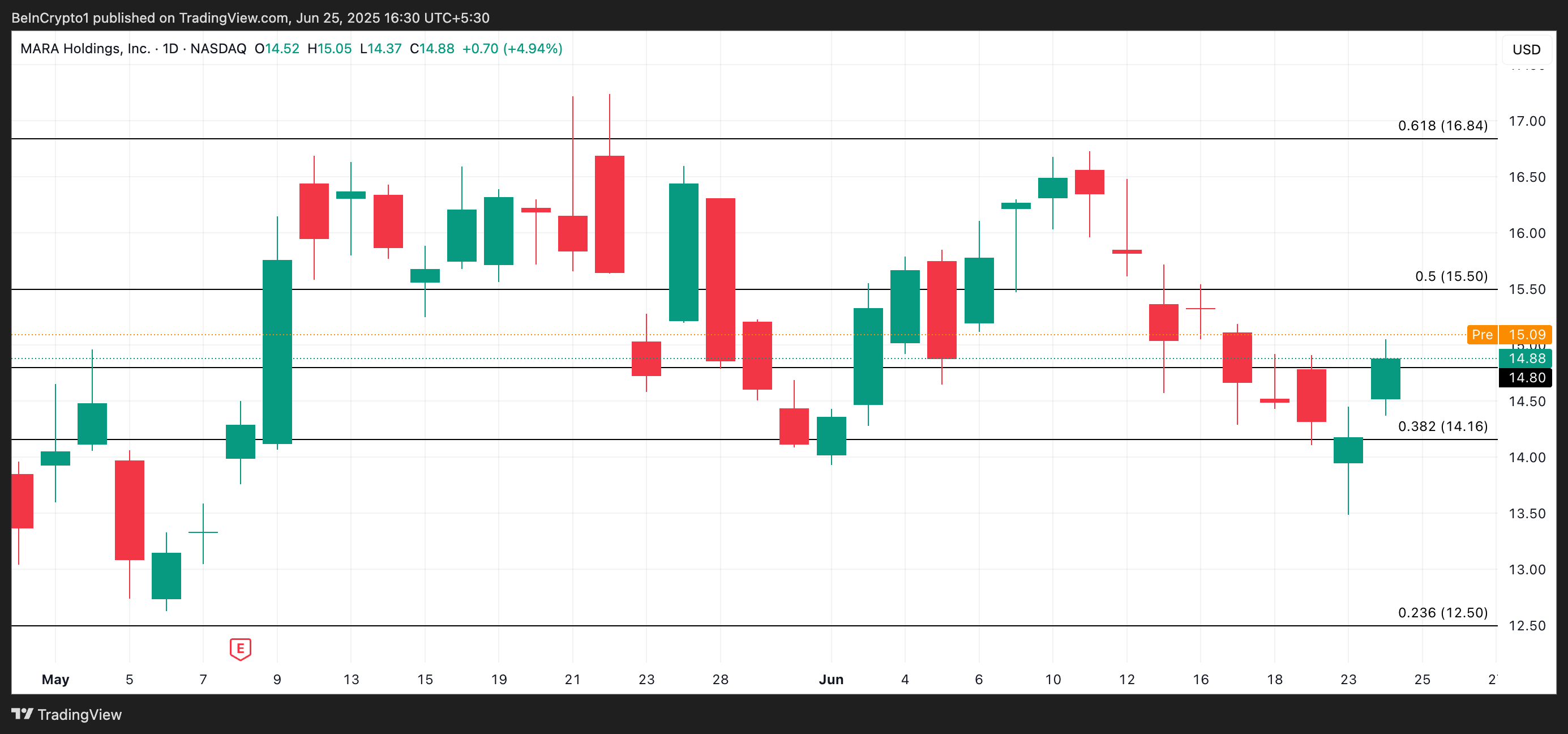 MARA lukkede på $14,88 i tirsdags, en stigning på 4,94% på dagen. Det bullish momentum er fortsat ind i dagens pre-market session, med aktien handlende til $15,11 i skrivende stund.