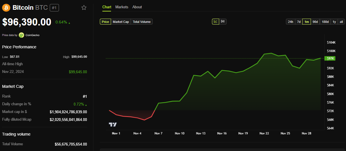 Med ETF’er, der spiller en afgørende rolle i Bitcoins udbredelse, kan deres fortsatte vækst opretholde BTC’s opadgående kurs. Forudsigelser antyder, at Bitcoin kan nå nye rekordhøjder, med nogle modeller, der sigter mod $117,000, hvis det nuværende momentum fortsætter. I øjeblikket handles BTC til $96,390, en beskeden stigning på 0,64% siden fredagens session åbnede.