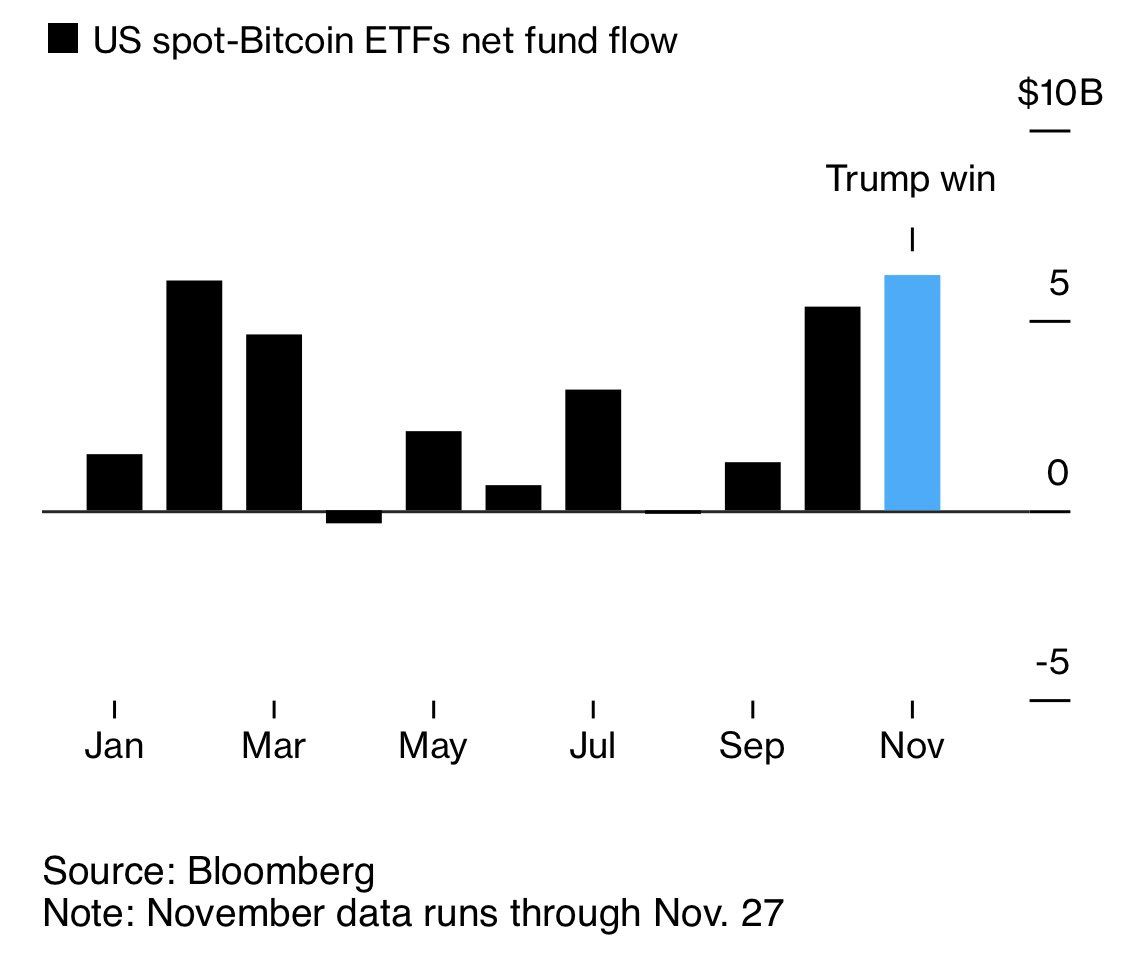 I mellemtiden afspejler de rekordstore indstrømninger i amerikanske Bitcoin spot ETF’er i november en konvergens af politiske og reguleringsmæssige begivenheder med investorstemning. Trumps pro-krypto holdning har genoplivet entusiasmen blandt investorer, hvilket driver både kurs- og udbredelsesmilepæle.