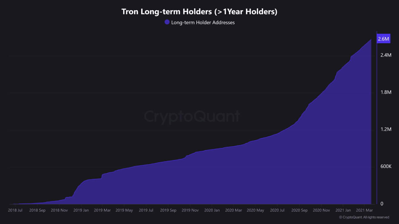 CryptoQuant rapporterer også, at 2,66 millioner TRX-adresser har holdt deres tokens i over et år uden at bruge dem. Disse wallets opretholder saldi på mindst 10 TRX. Selvom 10 TRX kun er værd et par dollars, vælger mange private investorer at holde TRON på lang sigt, selv med små mængder kapital.