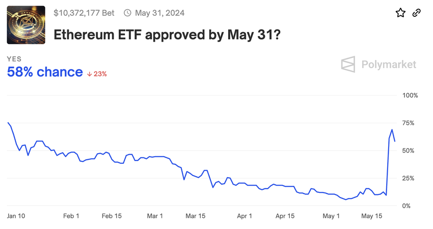 På samme måde har forudsigelsesplatforme som Polymarket vist en betydelig stigning i oddsene for godkendelse, som steg fra 10 % til 58 % i sidste uge.