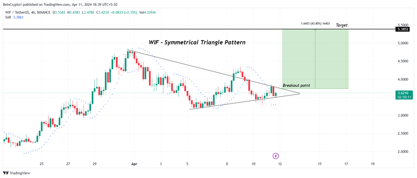 WIF-prisen bevæger sig i øjeblikket i et symmetrisk trekantmønster, og handles til $3,62. Meme-coinen er tæt på at bryde ud af trekanten, og ifølge mønsteret vil den sandsynligvis nå målet på $5,3.