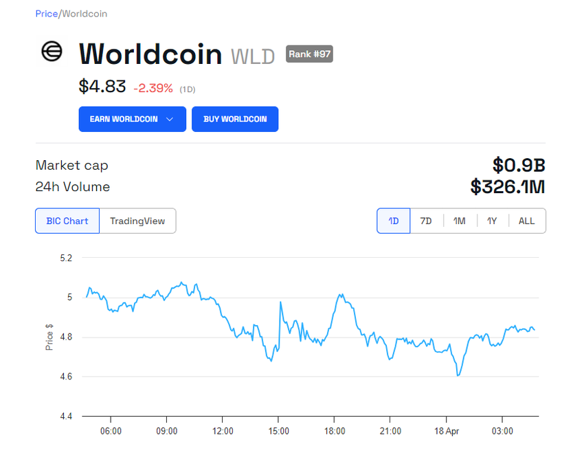 Interessant nok var prisudviklingen for Worldcoins oprindelige token, WLD, beskeden, efter at meddelelsen gik i luften. WLD handles i skrivende stund til $4,83, hvilket svarer til et fald på 2,39% i løbet af de sidste 24 timer.