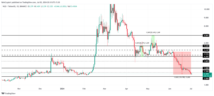 Worldcoins pris har noteret et fald på 58% siden begyndelsen af juni indtil i går. I skrivende stund kan altcoinen ses skifte hænder til $2.3. Det svæver over den kritiske modstand på $2,0.