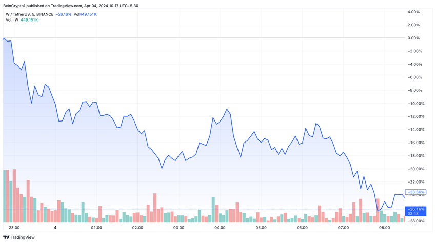 Midt i nedturen på kryptovalutamarkedet, styrtdykkede Wormhole-token med omkring 26% fra sin top. Faldet kom efter den meget ventede airdrop-begivenhed, som distribuerede 617,3 millioner W-tokens til over 400.000 wallets.