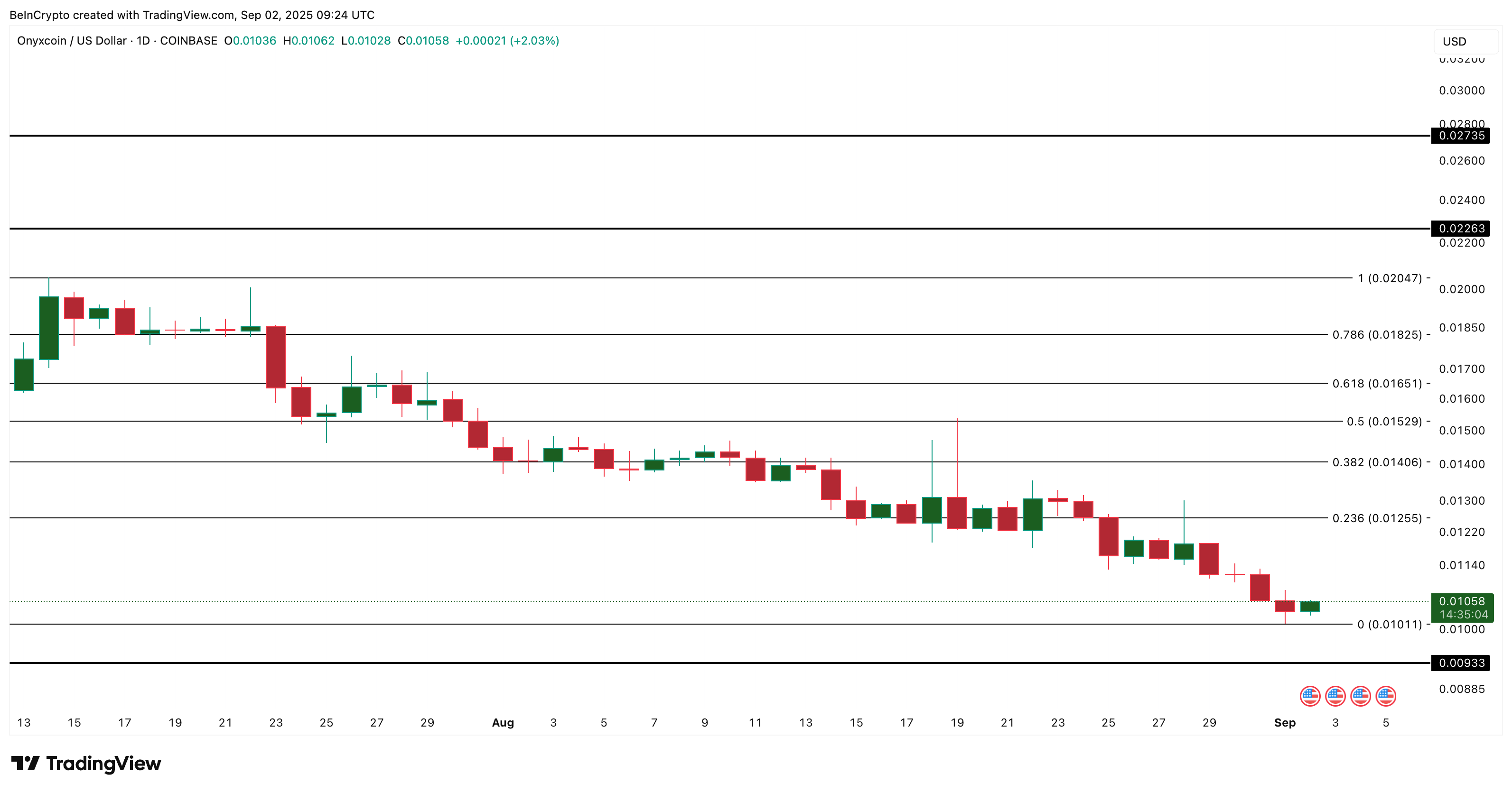 Diagrammet har trended nedad siden juli, så Fibonacci retracement-niveauer fra juli-toppen guider nøgle-niveauer. I øjeblikket er det afgørende at holde sig over $0.010. At miste det ville udsætte støtter nær $0.0093 og endda $0.0075.