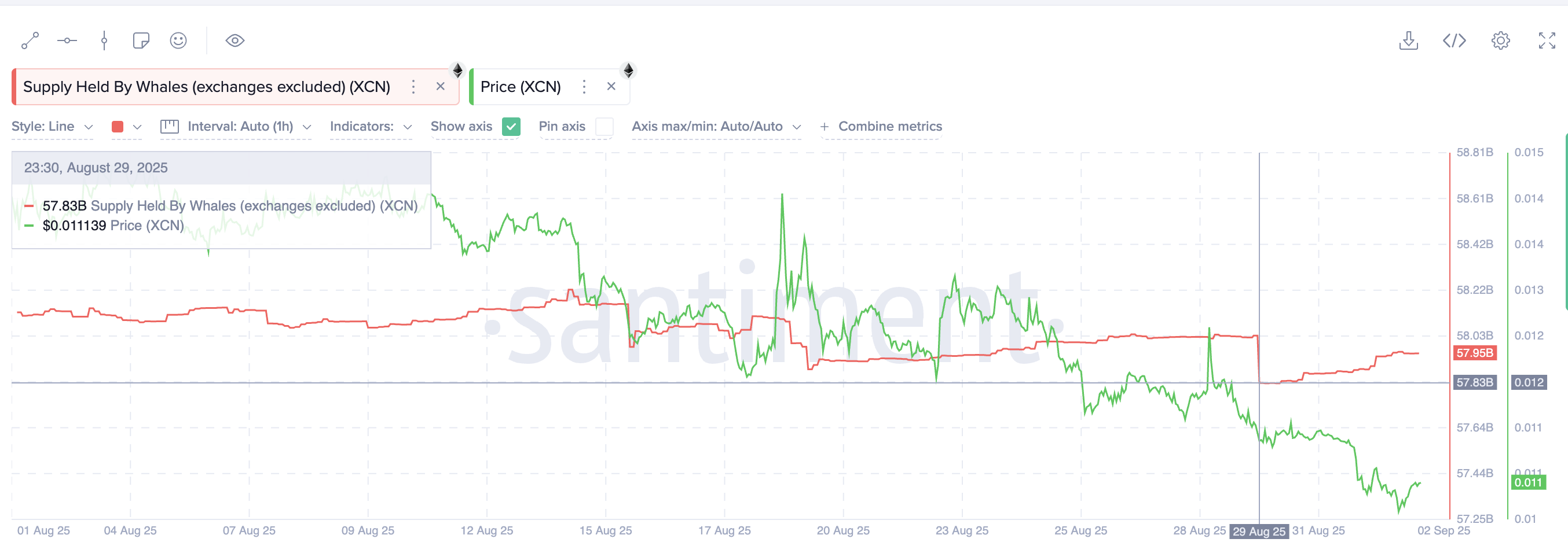 Mens stemningen blandt private investorer er kølnet, har hvaler stille og roligt akkumuleret. Siden 29. august har store wallets tilføjet omkring 120 millioner XCN tokens, værdisat til cirka $1.27 millioner til nuværende kurser. Bemærkelsesværdigt er det, at dette køb skete, mens kurserne faldt, hvilket antyder, at hvaler positionerer sig tidligt for et opsving.
