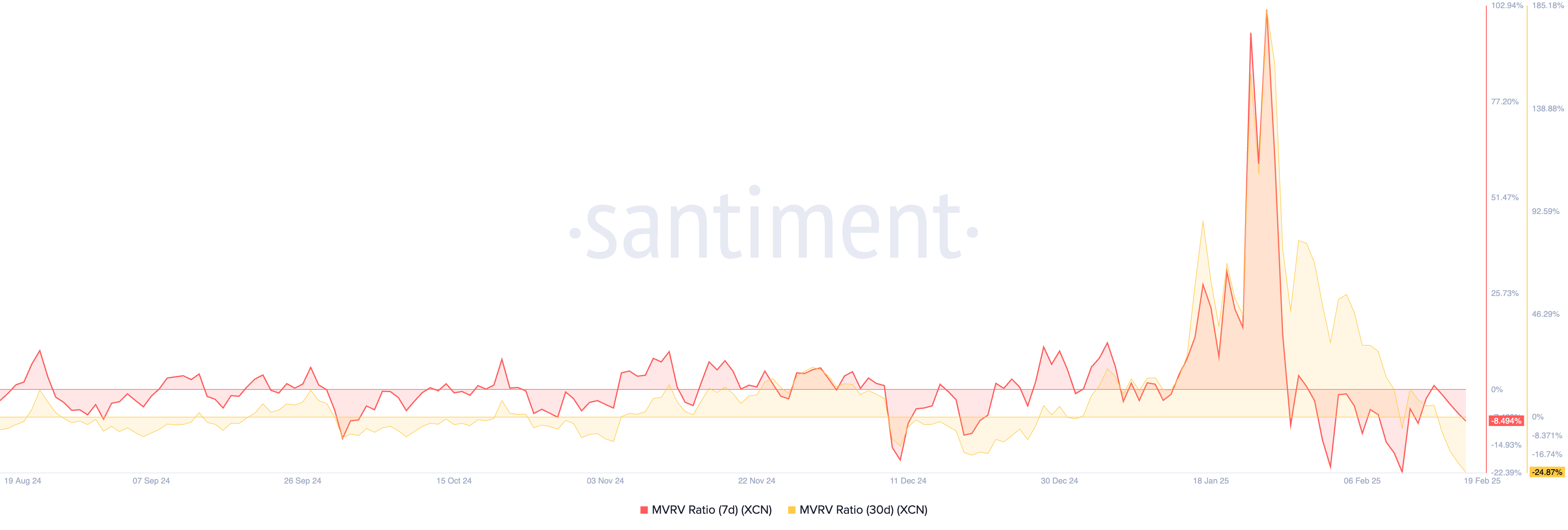BeInCryptos analyse af XCN’s marked værdi til realiseret værdi (MVRV) forhold, baseret på et 7-dages og 30-dages glidende gennemsnit, bekræfter, at tokenet i øjeblikket er undervurderet. Santiments data viser disse målinger på -8,49% og -24,87% henholdsvis i øjeblikket.