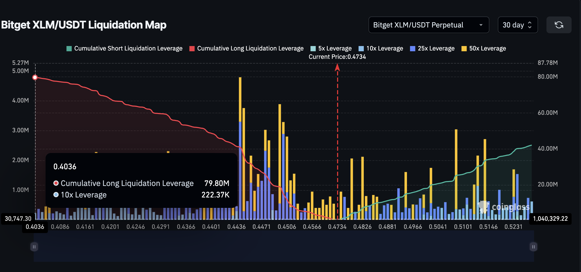 Kursen svæver over $0,45, men Bitgets 30-dages XLM/USDT afviklingskort viser cirka $79,8 millioner i lange positioner sammenlignet med omkring $42,1 millioner i shorts, med den kumulative klynge fremhævet under $0,40.