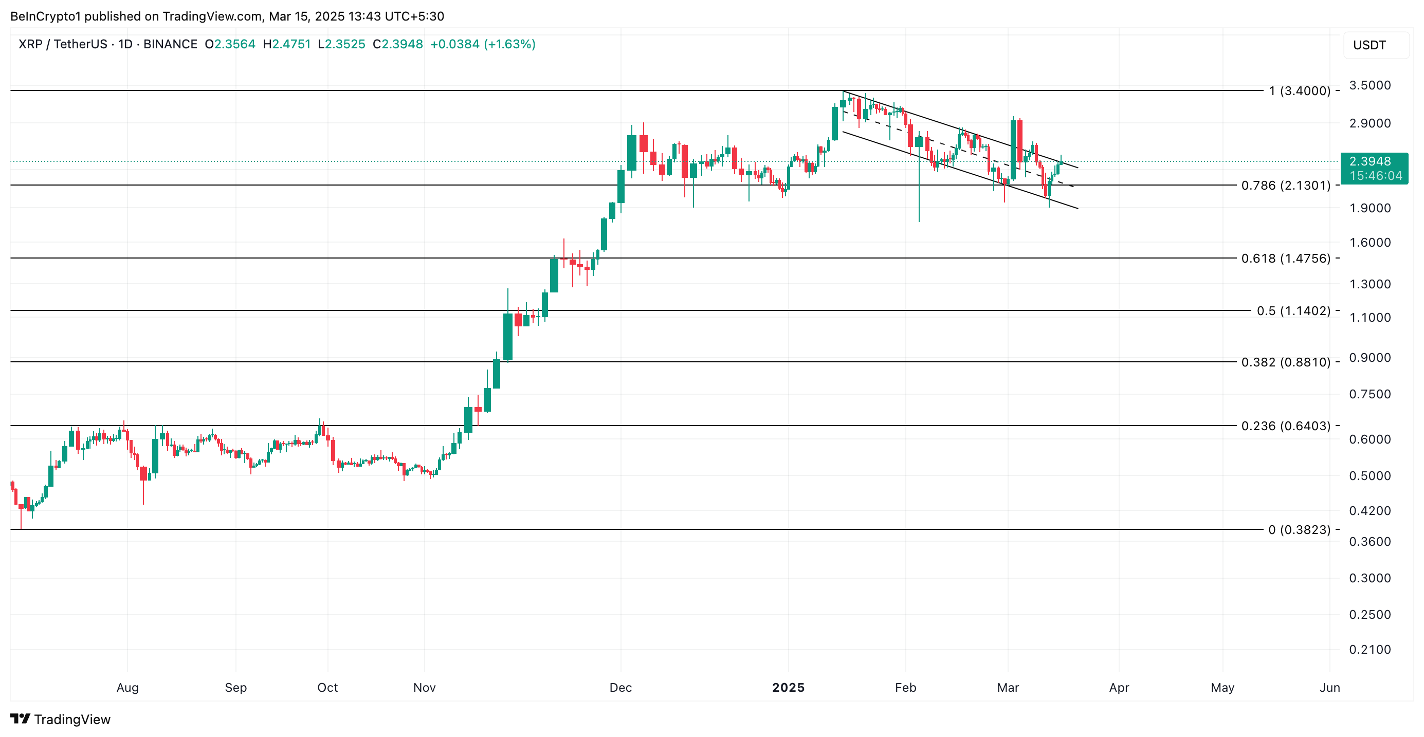 Hvis kursen bryder over kanalens øvre trendlinje, indikerer det en vending eller starten på en bullish trend. Dette signalerer et bullish skift i markedsstemningen over for XRP og en mulig mulighed for opadgående momentum, hvis efterspørgslen opretholdes.
