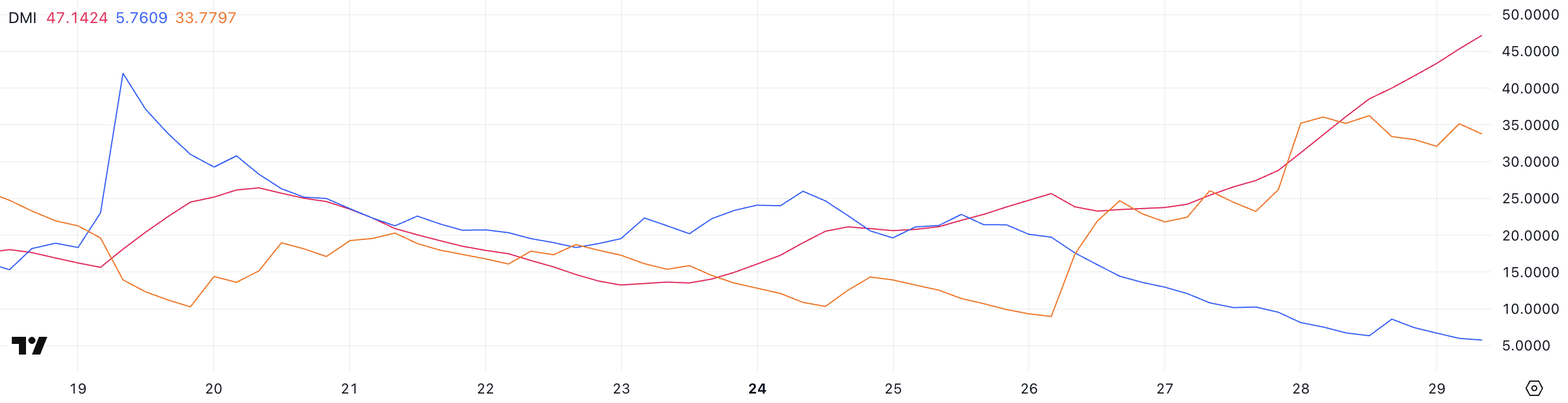Ved at dykke dybere ned i DMI-komponenterne, er +DI, der sporer opadgående købspres, faldet kraftigt fra 20,13 til 5,76. I mellemtiden er -DI, der sporer nedadgående salgspres, steget fra 8,97 til 33,77.