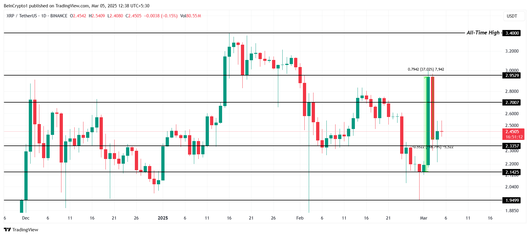XRP handles til $2,45, og holder sig stabilt over det kritiske støtteniveau på $2,33. Efter at have oplevet betydelig volatilitet i weekenden, formåede altcoinen at stabilisere sig og opnå en kursstigning på 37%. Denne bevægelse antyder, at XRP kan have det momentum, der er nødvendigt for yderligere gevinster, hvis den bullish trend fortsætter.