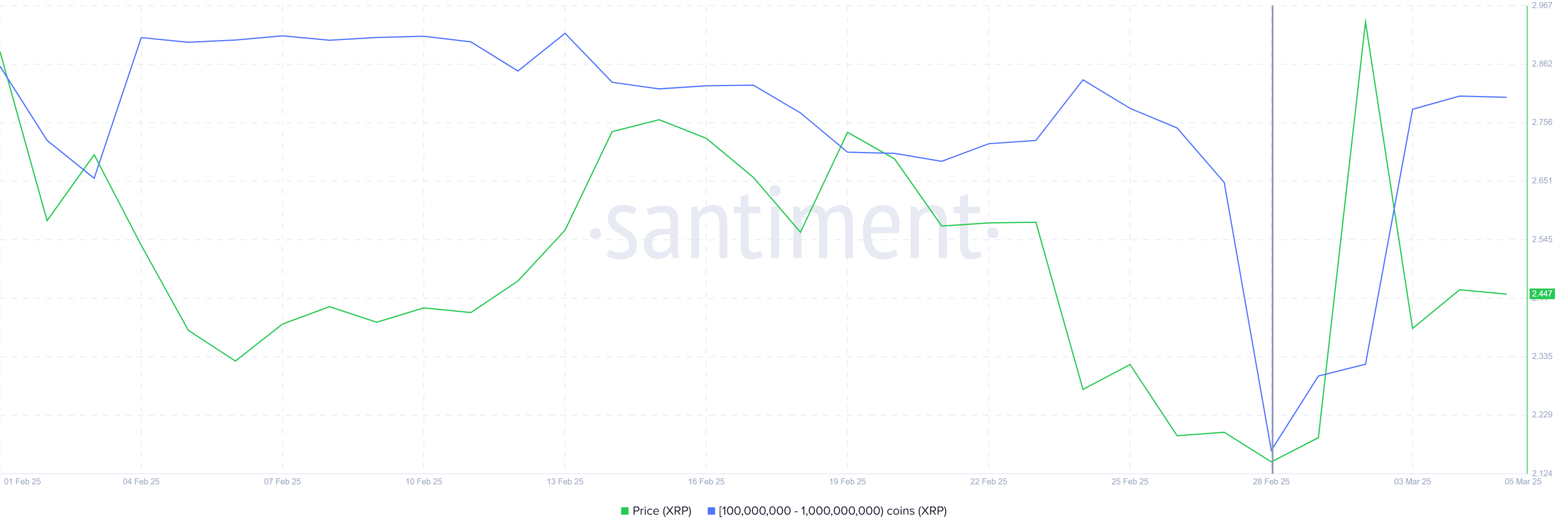 Hval-adresser, der holder mellem 100 millioner og 1 milliard XRP, har tilføjet 1,34 milliarder XRP til en værdi af over 3,26 milliarder dollars i den seneste uge. Mens nogle spekulerede i, at denne akkumulering var forbundet med XRP’s inkludering i den amerikanske Crypto Reserve, ser det ud til, at hvalerne primært købte til lave priser.