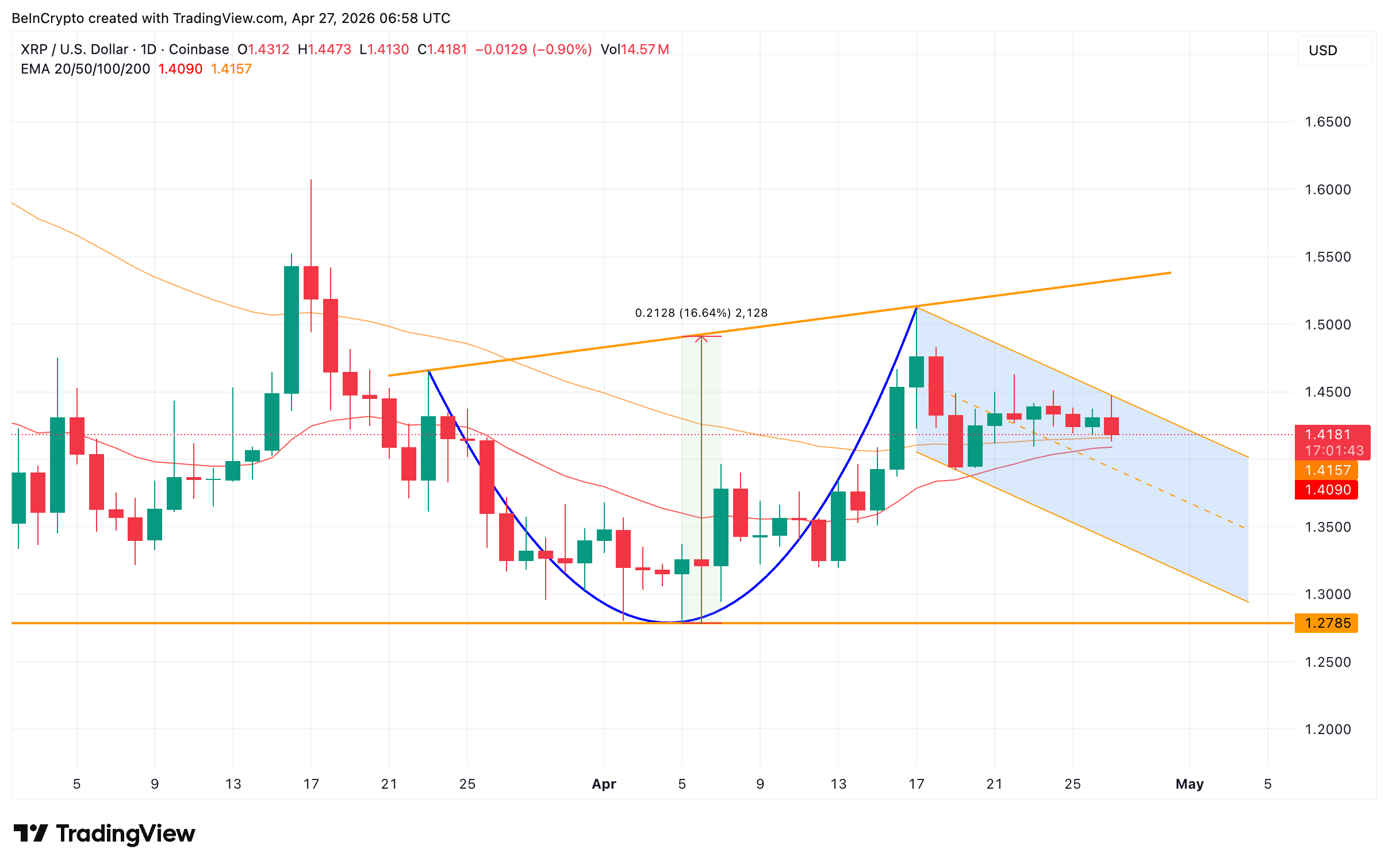 XRP (XRP) handles til $1,41 den 27. april og befinder sig i øjeblikket i en faldende kanal—handle-delen—der har holdt siden 17. april og trykker mod et tæt bånd af glidende gennemsnit. Diagrammet ser klar ud til et udbrud. Under overfladen peger exchange flows og data om købspriser dog i en anden retning.