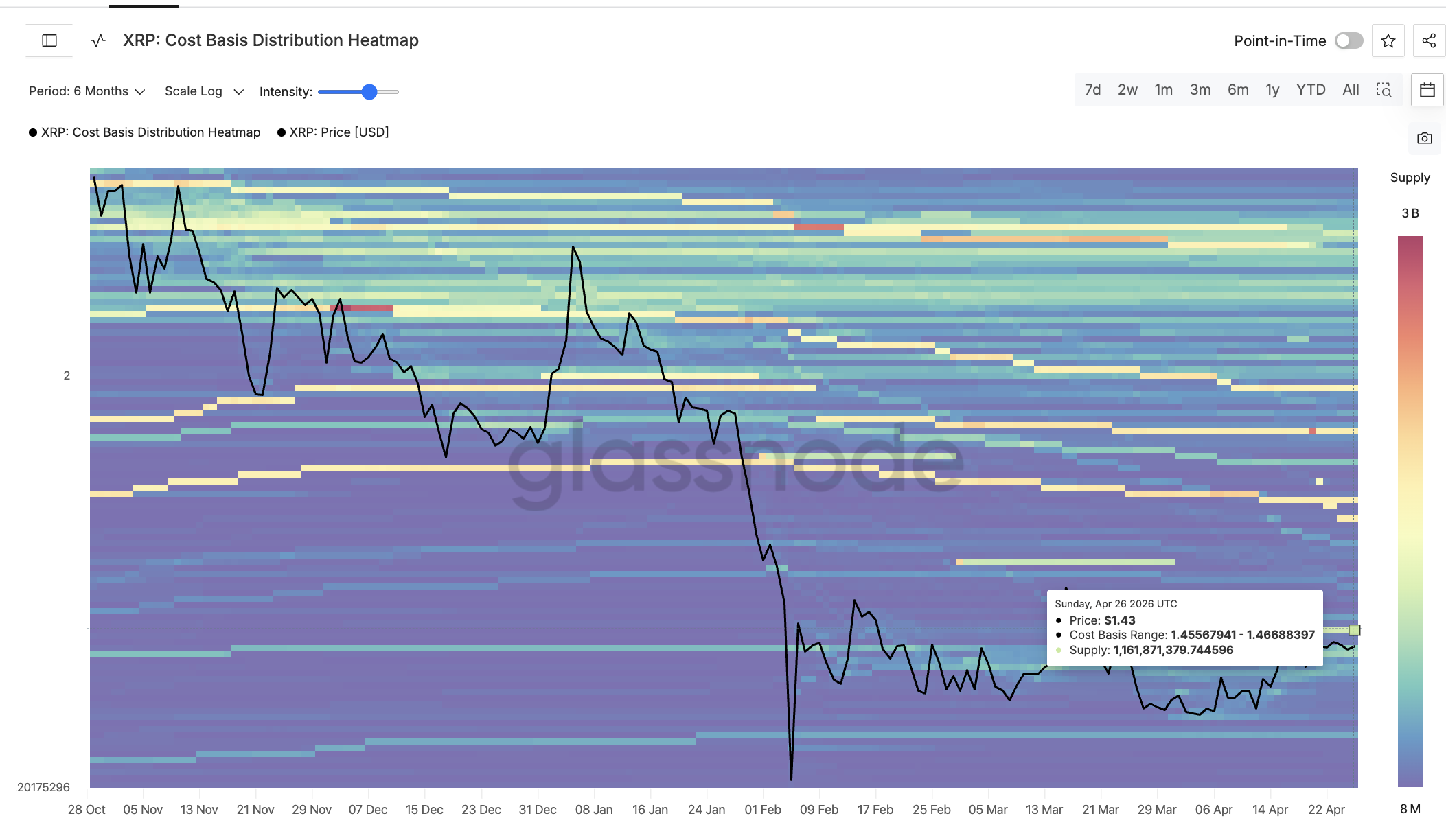 Den anden advarsel ligger lige over nuværende kurs. Ifølge Glassnodes Cost Basis Distribution Heatmap—en måling af, hvor stor en del af XRP-udbuddet er købt ved hver kurs—ligger der en tung klynge mellem $1,45 og $1,46.