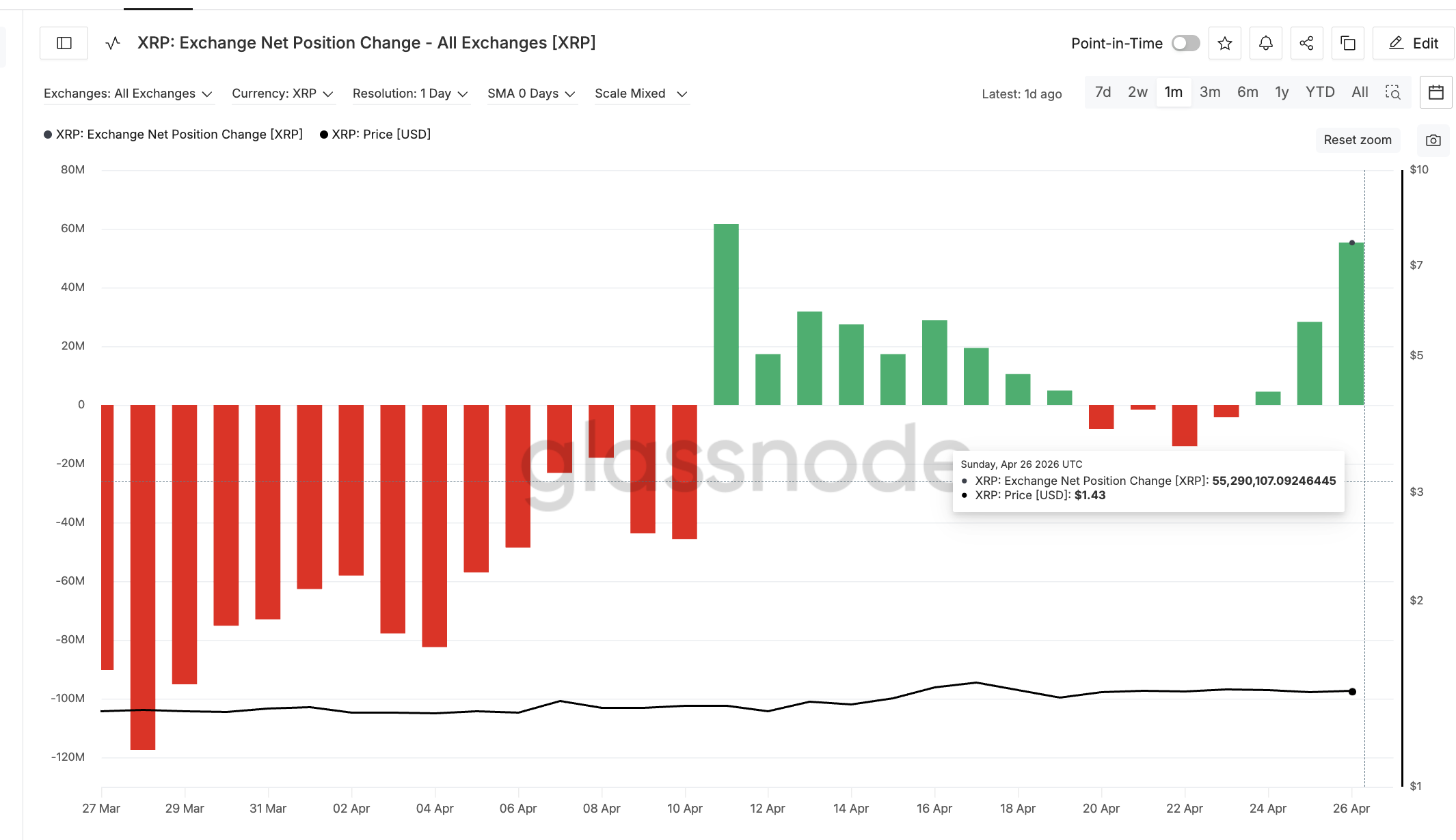 Den 24. april viste målingen +4,56 millioner XRP. D. 26. april var tallet steget til +55,29 millioner, altså omtrent 12 gange højere. Det markerede tre dage med stigende tilførsler til børser. Investorer sender XRP til børser i større mængder; denne positionering har ofte forudgået salgspres.