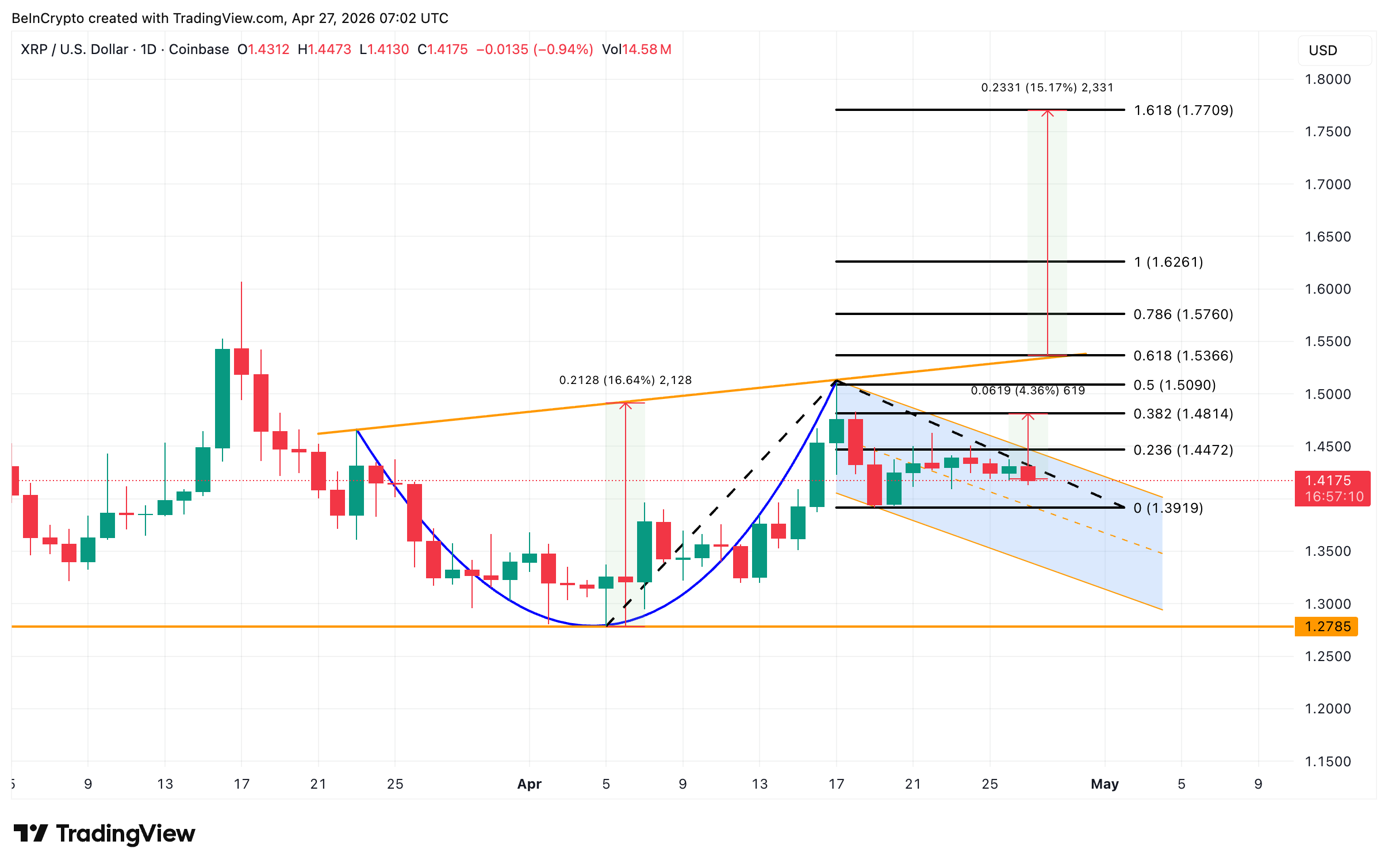 XRP er ved at danne et cup and handle-mønster, en bullish fortsættelsesstruktur hvor kursen stiger fra et lavpunkt i en U-form og derefter konsoliderer i et let fald, før den bryder opad. ‘Cuppen’ blev formet mellem slutningen af marts og midten af april med XRP nær bunden på $1,27. Handlet er den faldende kanal, der har udviklet sig siden toppen 17. april, og kursen tester nu den øvre grænse.