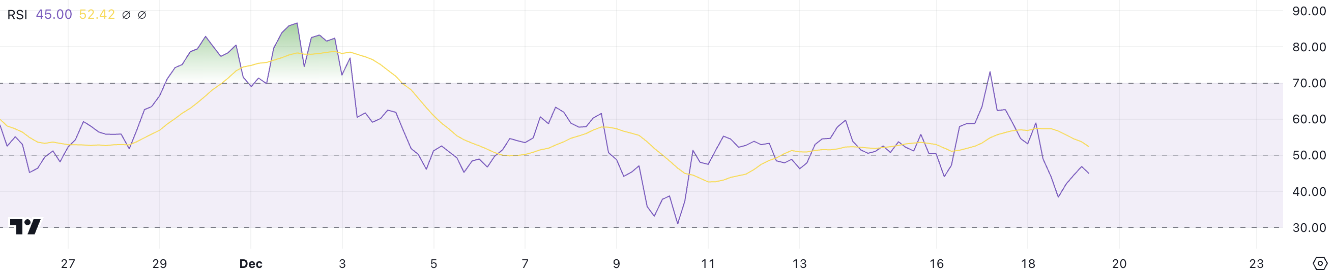 Med XRP RSI på 45 er markedet i en neutral zone, men det nylige fald antyder en bearish tendens, hvilket gør kursen sårbar over for yderligere korrektioner, medmindre bullish momentum vender tilbage.