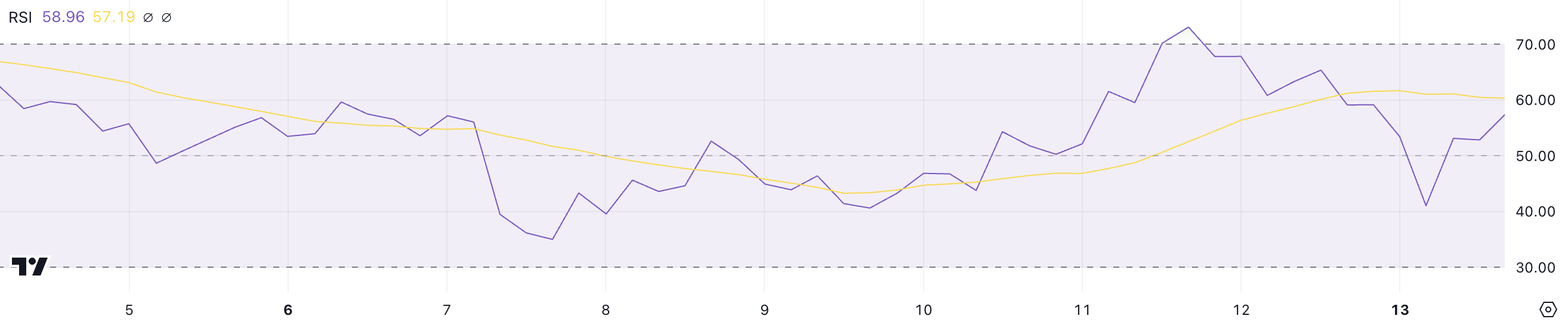 XRP RSI er steget markant til 58,9 fra 41 på bare en dag, hvilket indikerer en markant stigning i bullish momentum. Den skarpe stigning afspejler styrket købspres, da XRP bevæger sig tættere på overkøbt territorium.