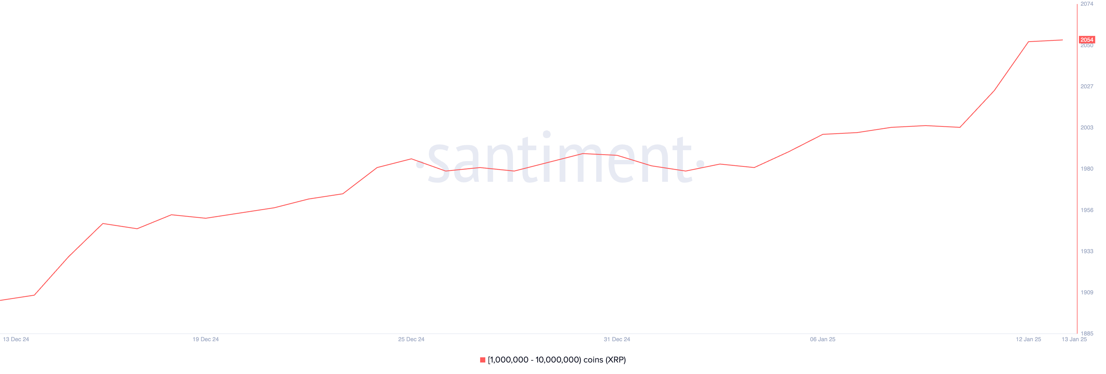 Antallet af XRP hvaler — adresser, der holder mellem 1 million og 10 millioner XRP — er steget til et rekordhøjt niveau på 2.054, op fra 2.004 for bare fire dage siden.