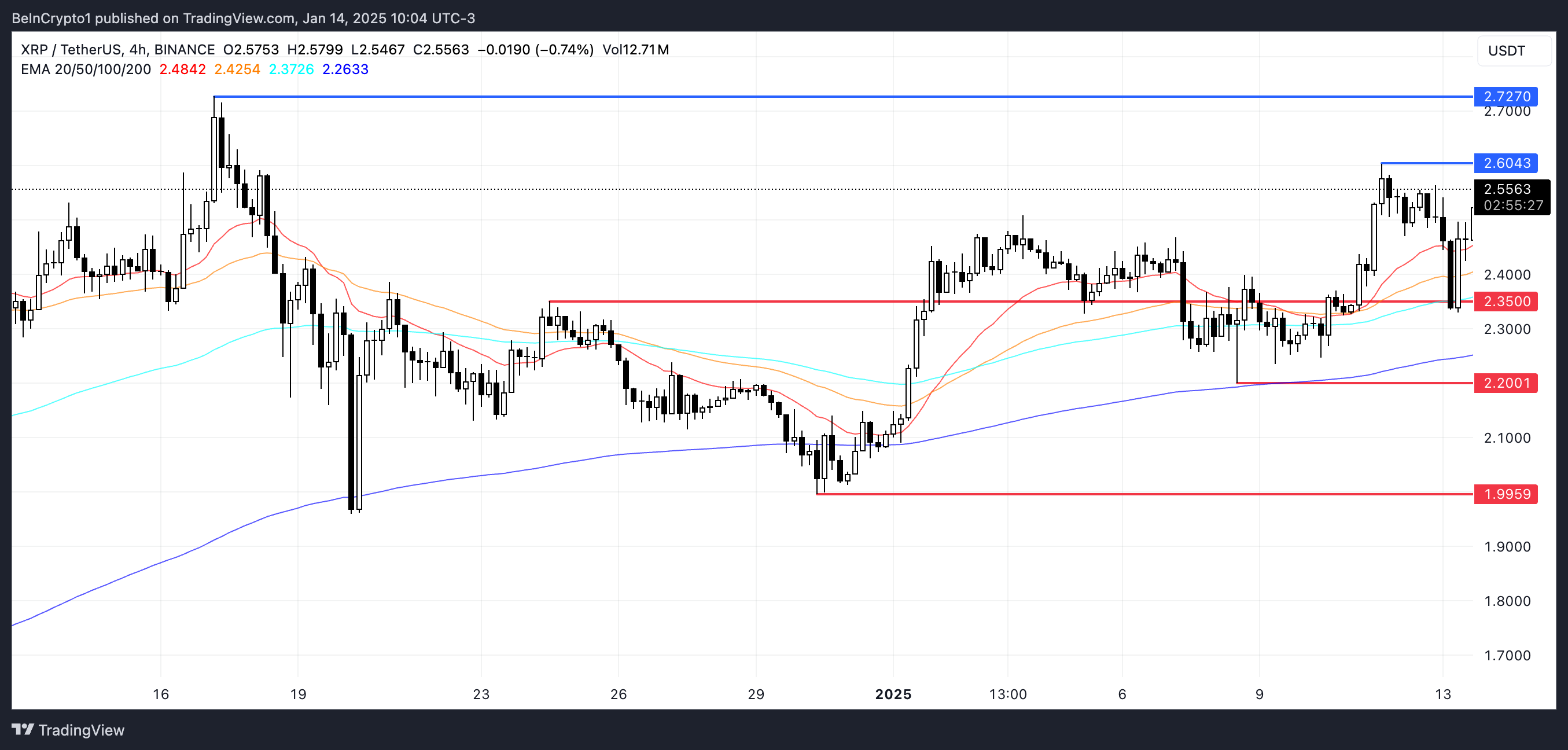 XRP EMA-linjer er i øjeblikket i en bullish konfiguration, med kortsigtede EMA’er placeret over langsigtede. Denne justering antyder stærkt opadgående momentum, og hvis modstanden ved $2,6 testes og brydes, kan det bane vejen for yderligere gevinster.