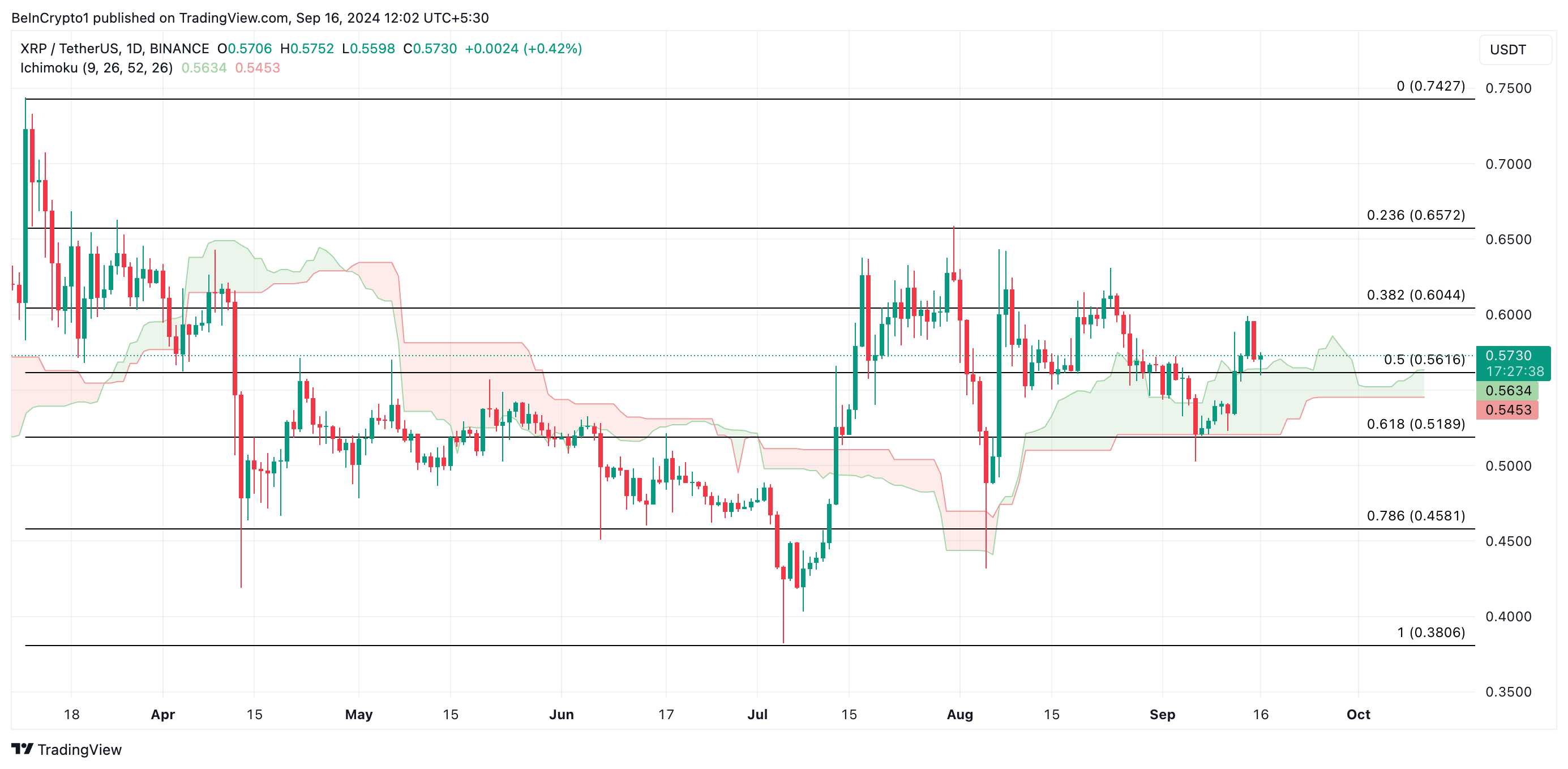 Når XRP falder under Leading Span A, kan salgstrykket øges, hvilket skubber altcoinen ind i en mere bearish zone. En tilgang til Leading Span B markerer endnu et væsentligt støtteniveau, og hvis dette brydes, kan XRP gå ind i en dybere nedadgående trend, potentielt faldende til dens 5. august-lav på $0.38.