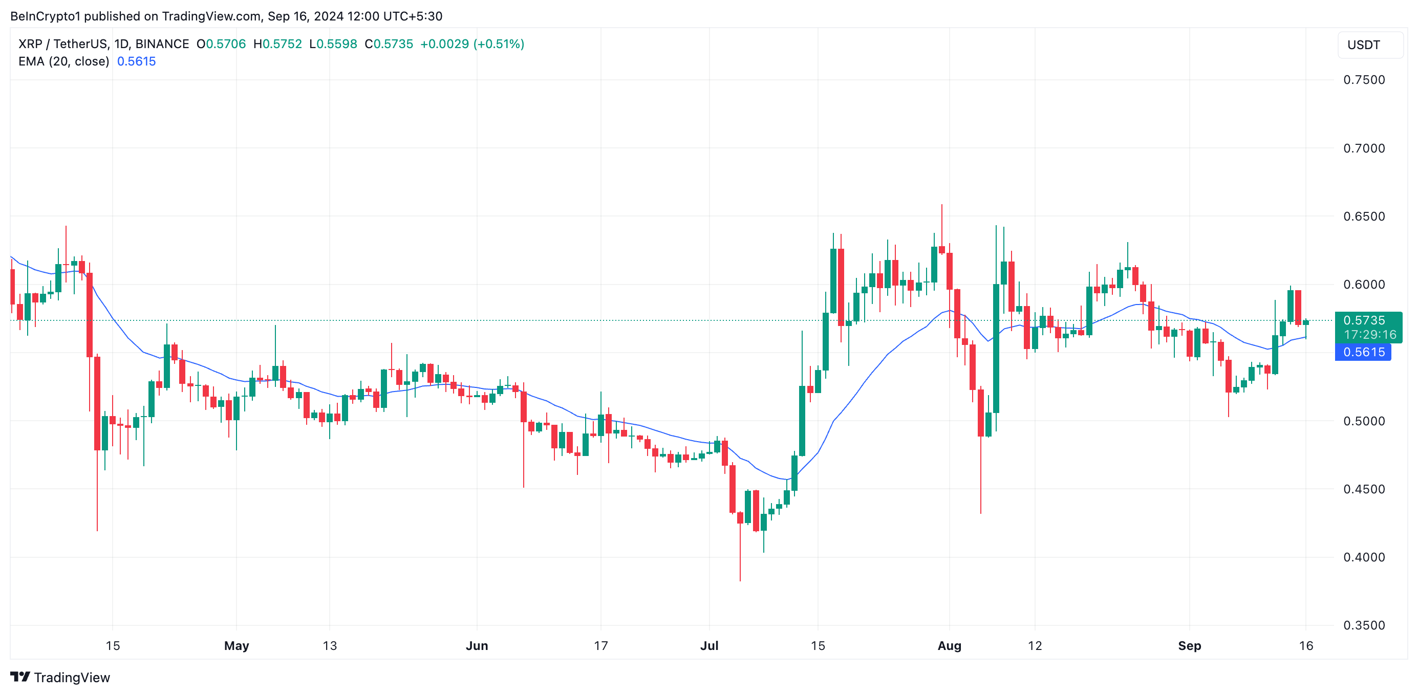Når et aktiv oplever et fald i netværksaktivitet, betyder det normalt, at færre adresser interagerer med dets blockchain, hvilket signalerer reduceret interesse. Dette har været tilfældet med XRP, da dens kurs begyndte at falde sammen med et fald i daglige aktive og nye adresser. I øjeblikket handles den til $0.57, XRP’s værdi er faldet med 3% over de sidste to dage.
