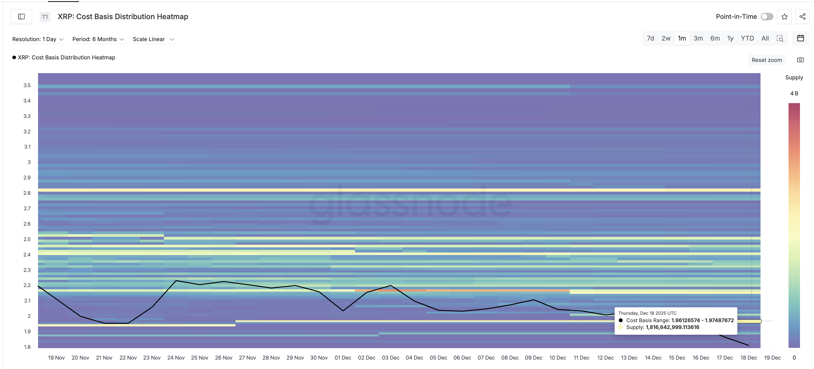 On-chain data over købspriser viser et stort udbud mellem $1,96 og $1,97. Cirka 1,82 milliarder XRP blev akkumuleret i dette område. Disse data viser, hvor investorer har købt deres coins. Når kursen når disse niveauer igen, bliver mange investorer break-even og vælger ofte at sælge.