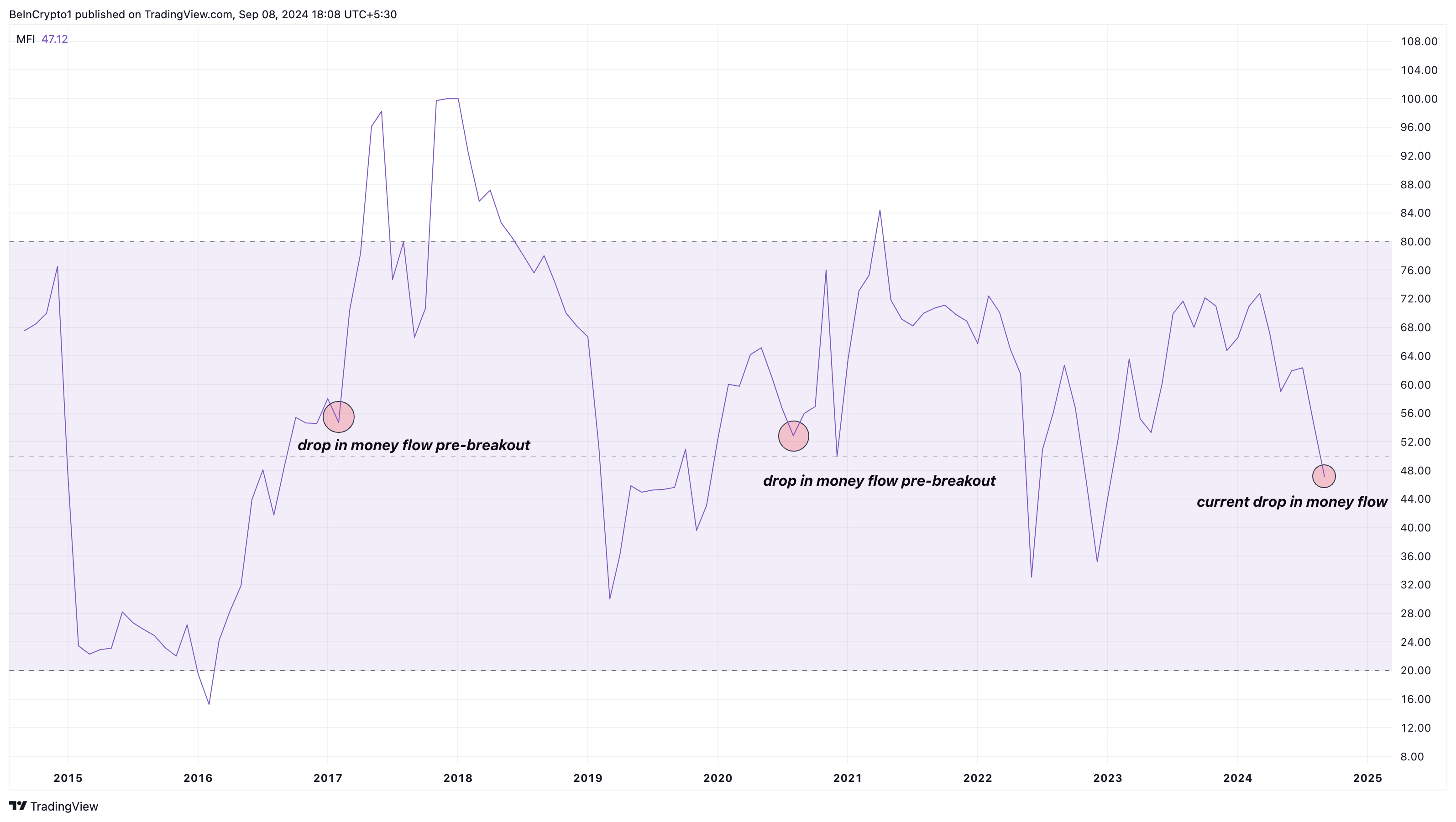 Det er også vigtigt at nævne tendensen vist af Money Flow Index (MFI). Tilbage i 2017 faldt MFI-læsningen betydeligt før opsvinget. I 2020 gentog den tekniske indikator en næsten identisk tendens før det store træk over $1.