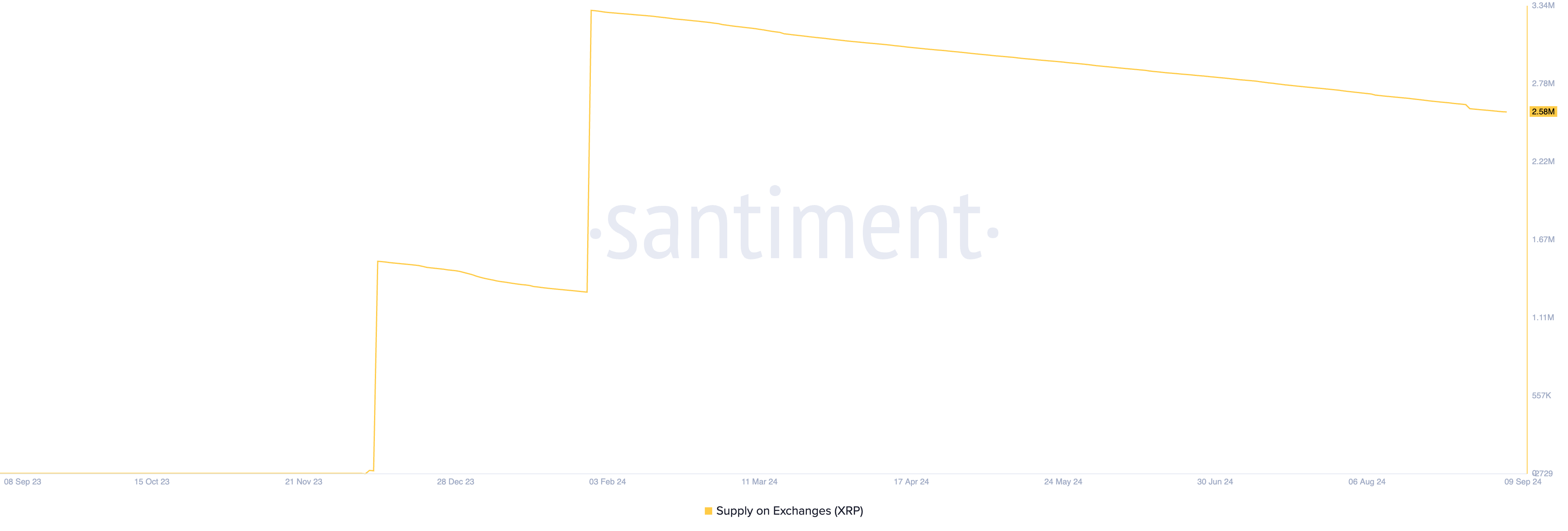 I øjeblikket holdes 2,58 millioner XRP-tokens, værdisat til 1,32 millioner dollars til nuværende markedspriser, på kryptovalutabørser. Ifølge Santiment er denne mængde faldet med 28% siden den 1. februar.